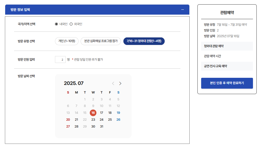 - 네이버 예약: 포털에 “청와대 관람 예약” 검색 → 네이버 예약 페이지 접속