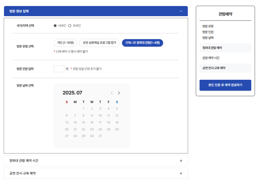 - 네이버 예약: 포털에 “청와대 관람 예약” 검색 → 네이버 예약 페이지 접속